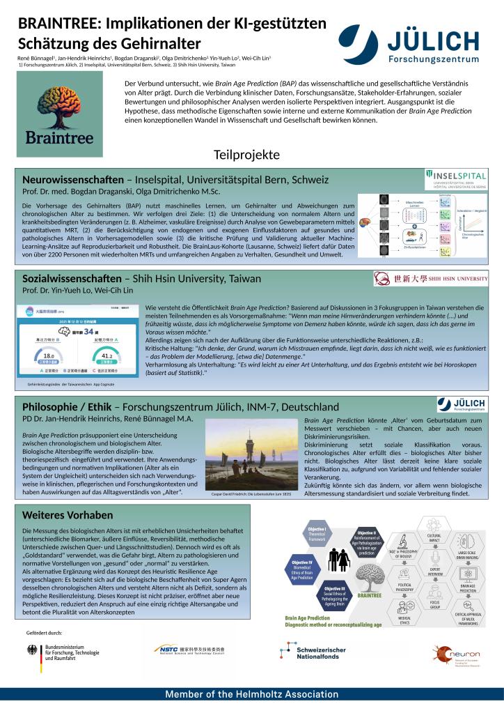 BrainTree is a ERA-NET Neuron project conducted in Germany, Switzerland and Taiwan. It delves into the ethical considerations of Brain Age prediction. Modern neuroscience using machine learning and brain MRI scans empowers us to assess the biological age of a brain, potentially revealing early signs of disease. While brain age prediction holds immense promise for medical diagnosis and prognosis, it also raises significant ethical questions. We aim to illuminate the potential benefits and risks of this emerging technology, while also exploring the ethical frameworks necessary for its responsible application in clinical settings.